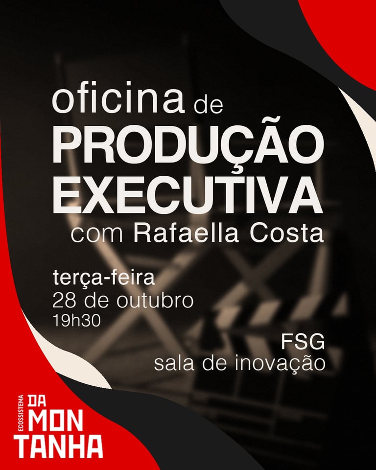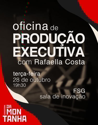Oficina de Produção Executiva com Rafaella Costa, promovida pelo Ecossistema da Montanha, para estudantes e profissionais da área que querem compreender de perto o papel estratégico da produção executiva no audiovisual. Com ampla experiência em produção executiva e criativa, Rafaella colaborou em projetos para grandes plataformas como Disney+, HBO, Netflix e Amazon Prime Video.
